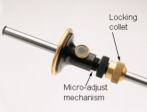 Запатентованная конструкция позволяет с высокой точностью регулировать перемещение упора по стержню – полный оборот “гайки” перемещает упор на 0,8 мм, соответственно 1/8 оборота перемещает упор на 0,1 мм.